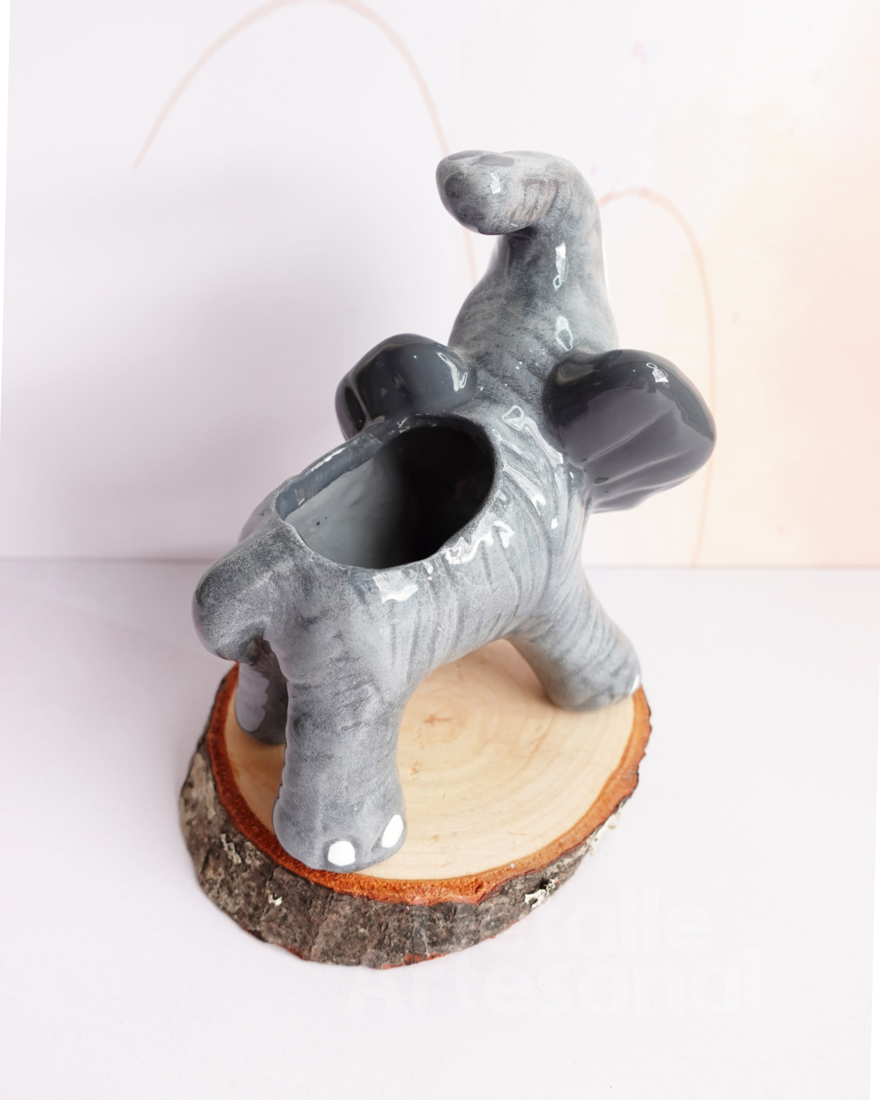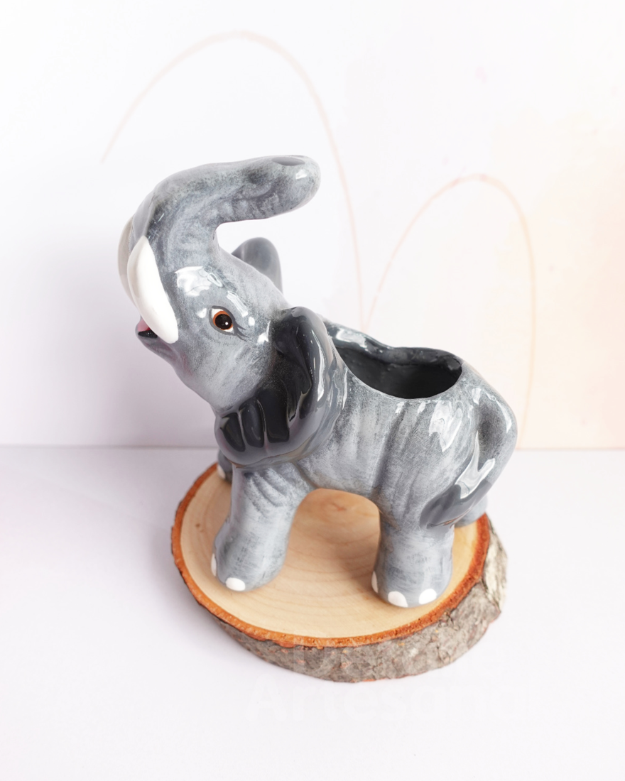 Matera en cerámica en forma de Elefante con colmillos, resinada e impermeabilizada para mayor protección al polvo y humedad. Vendría con planta natural*, piedritas decorativas, tarjeta de cuidados y bolsa de papel kraft. (La base de madera no viene incluida, sólo hace parte de la decoración de la imágen).