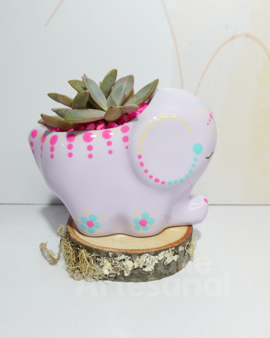 Matera en cerámica en forma de Elefante tamaño pequeño, pintada con técnica de puntillismo, resinada e impermeabilizada para mayor protección al polvo y humedad. Vendría con planta natural*, piedritas decorativas, tarjeta de cuidados y bolsa de papel kraft. ( La base de madera no viene incluida, sólo hace parte se la decoración de la imágen).
