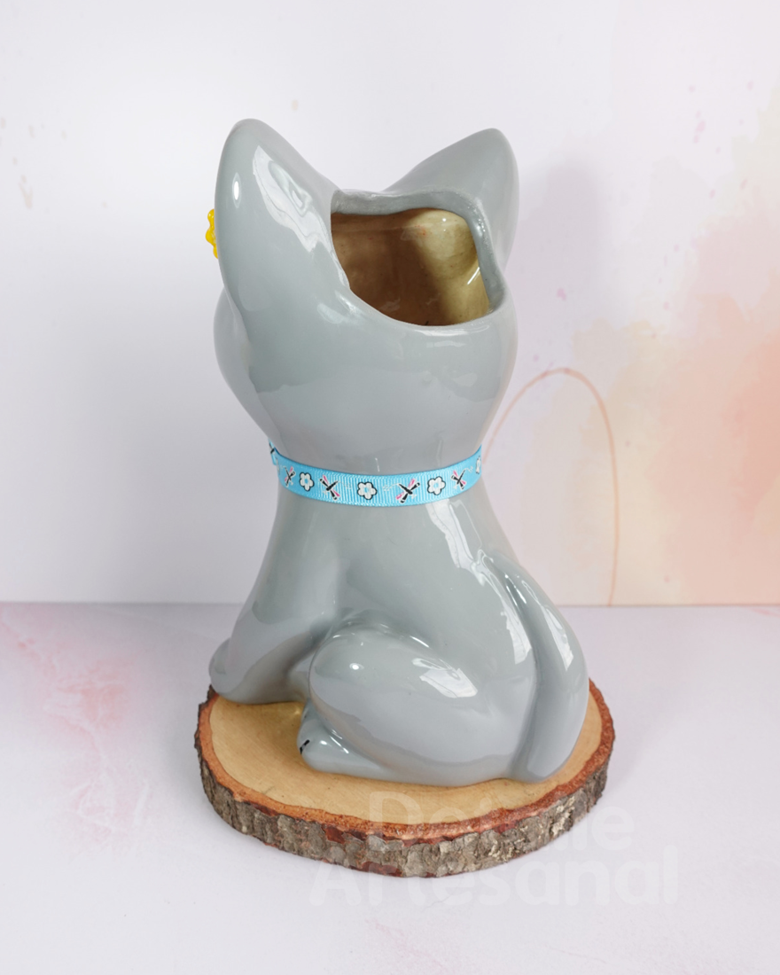 Matera en cerámica en forma de Gato con la patita arriba, resinada e impermeabilizada para mayor protección al polvo y humedad. Vendría con planta natural*, piedritas decorativas, tarjeta de cuidados y bolsa de papel kraft. (La base de madera no viene incluida, sólo hace parte de la decoración de la imágen).