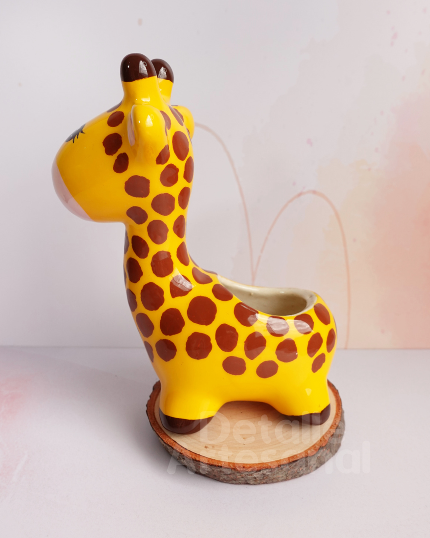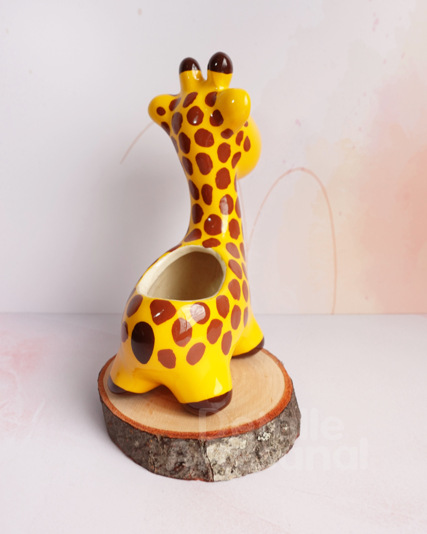 Matera en cerámica en forma de Jirafa, resinada e impermeabilizada para mayor protección al polvo y humedad. Vendría con planta natural*, piedritas decorativas, tarjeta de cuidados y bolsa de papel kraft. (La base de madera no viene incluida, sólo hace parte de la decoración de la imágen).