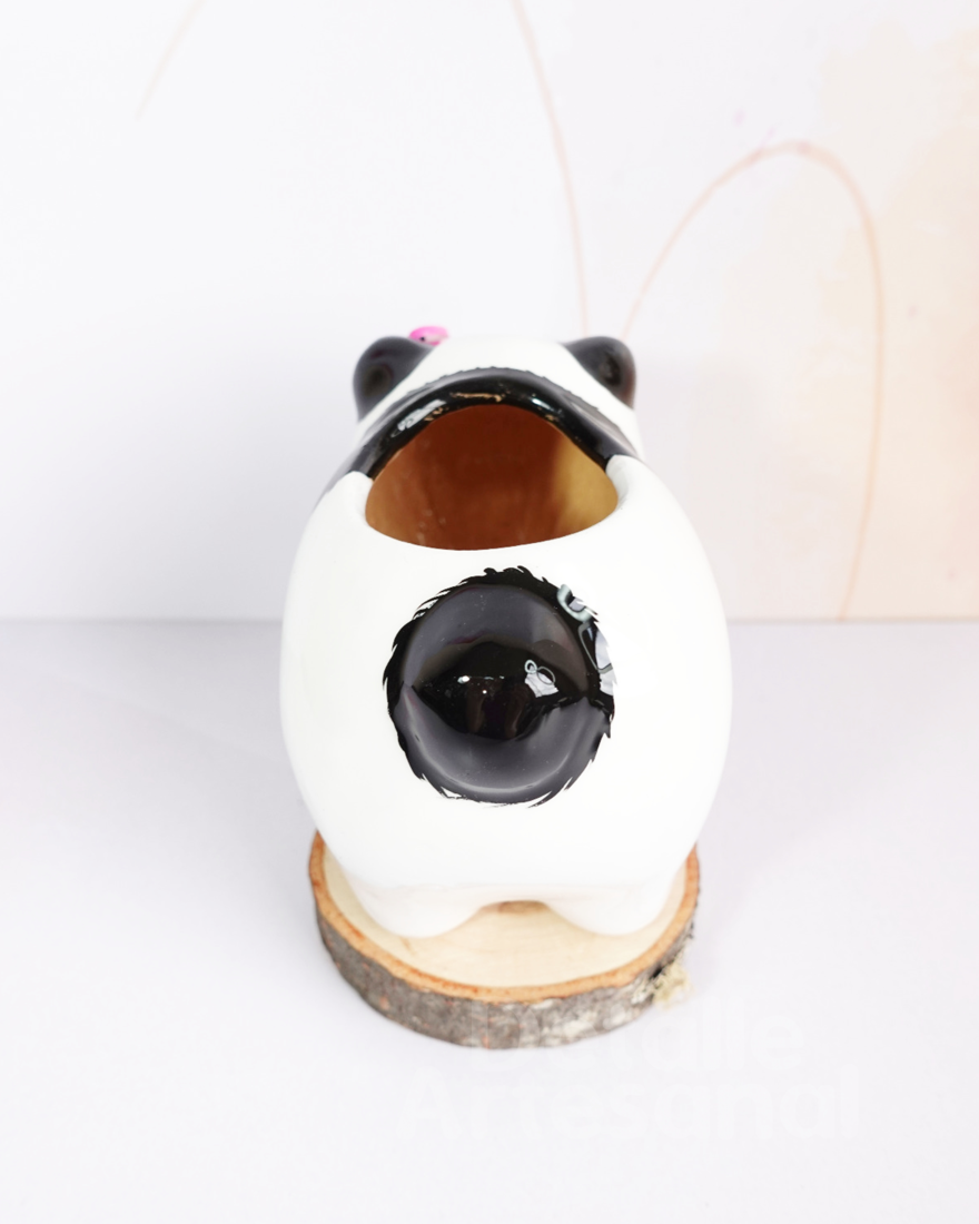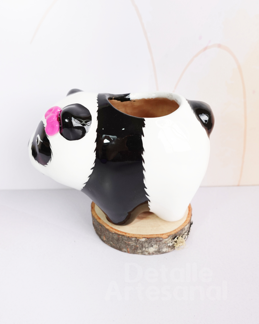 Matera en cerámica en forma de Osa panda, resinada e impermeabilizada para mayor protección al polvo y humedad. Vendría con planta natural*, piedritas decorativas, tarjeta de cuidados y bolsa de papel kraft. (La base de madera no viene incluida, sólo hace parte de la decoración de la imágen).
