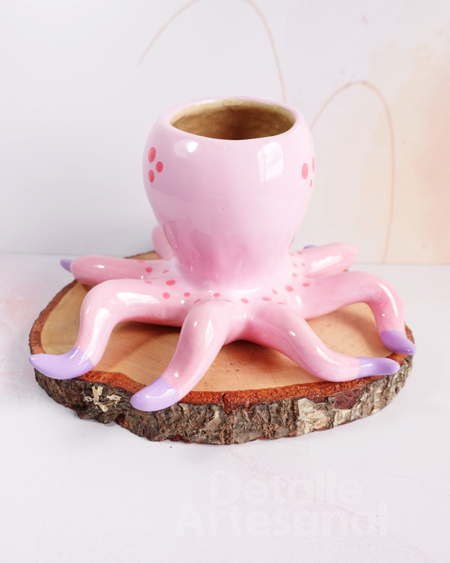 Matera en cerámica en forma de Pulpo, resinada e impermeabilizada para mayor protección al polvo y humedad. Vendría con planta natural*, piedritas decorativas, tarjeta de cuidados y bolsa de papel kraft. (La base de madera no viene incluida, sólo hace parte de la decoración de la imágen).