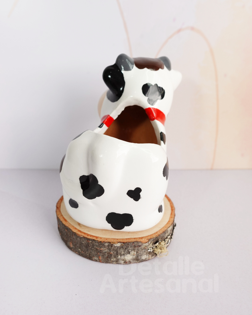 Matera en cerámica en forma de Vaca con campana pequeña, resinada e impermeabilizada para mayor protección al polvo y humedad. Vendría con planta natural*, piedritas decorativas, tarjeta de cuidados y bolsa de papel kraft. (La base de madera no viene incluida, sólo hace parte de la decoración de la imágen).