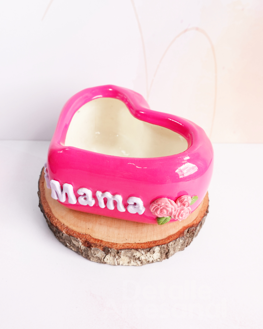 Matera en cerámica en forma de Corazón con mensaje "para ti mamá", resinada e impermeabilizada para mayor protección al polvo y humedad. Vendría con planta natural*, piedritas decorativas, tarjeta de cuidados y bolsa de papel kraft. (La base de madera no viene incluida, sólo hace parte de la decoración de la imágen).