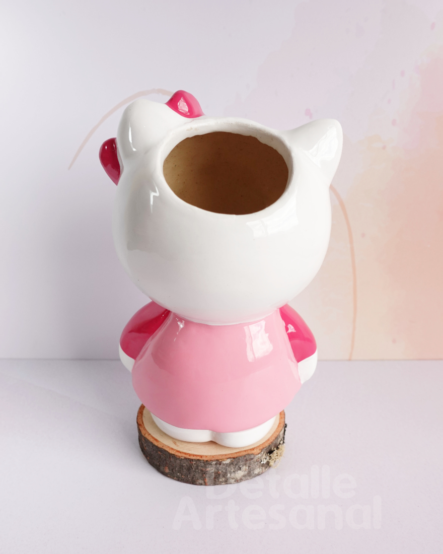 Matera en cerámica en forma Hello Kitty de tamaño mediana, resinada e impermeabilizada para mayor protección al polvo y humedad. Vendría con planta natural*, piedritas decorativas, tarjeta de cuidados y bolsa de papel kraft. (La base de madera no viene incluida, sólo hace parte de la decoración de la imágen).