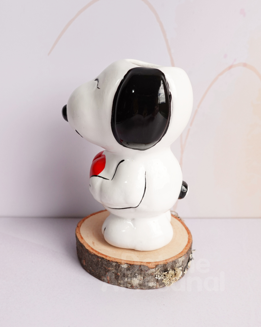Matera en cerámica en forma Snoopy, resinada e impermeabilizada para mayor protección al polvo y humedad. Vendría con planta natural*, piedritas decorativas, tarjeta de cuidados y bolsa de papel kraft. (La base de madera no viene incluida, sólo hace parte de la decoración de la imágen).